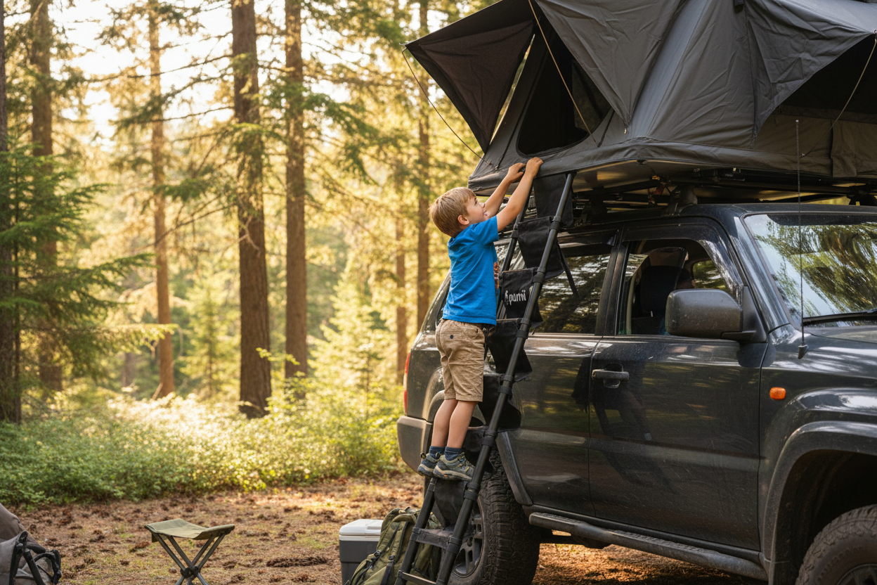 Die piki Stoffstufen machen den Einstieg ins Dachzelt spürbar angenehmer. Kein kaltes Metall, kein Rutschen, keine schmerzenden Füße. Die weich gepolsterten Stufen sorgen für sicheren Halt und sind barfußfreundlich – besonders angenehm morgens und abends.